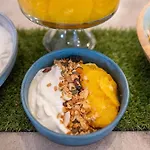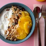 Ein reichhaltiges Frühstück, das Käse, frisches Gebäck und frisches Obst umfasst, wird jeden Tag serviert.